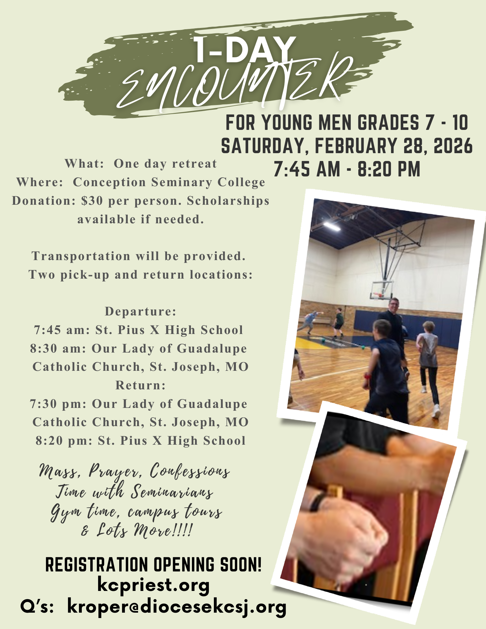 Q’s: Kelly Roper (Office Manager | Events Coordinator) 816-714-2381 or kroper@diocesekcsj.org